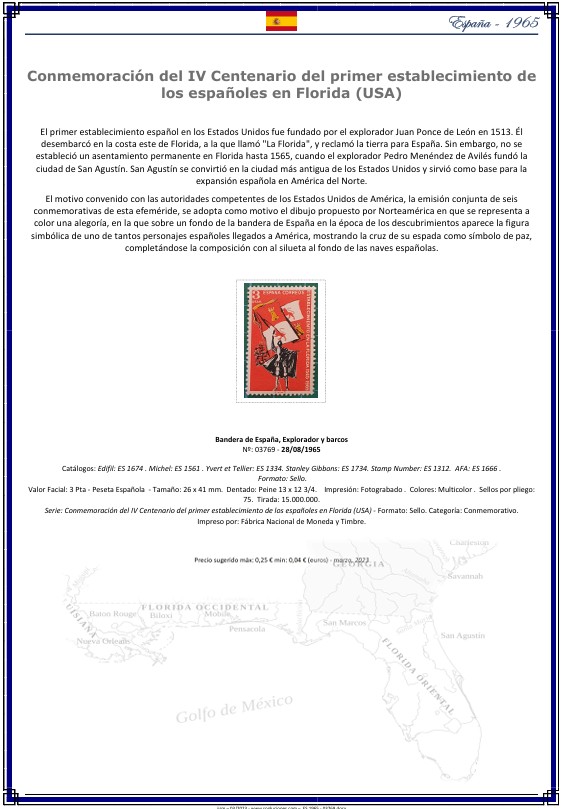 Ficha PDF – Sellos España 1965: IV Centenario del primer establecimiento de los españoles en Florida (Catálogo Sooluciones ES-1965-03769)