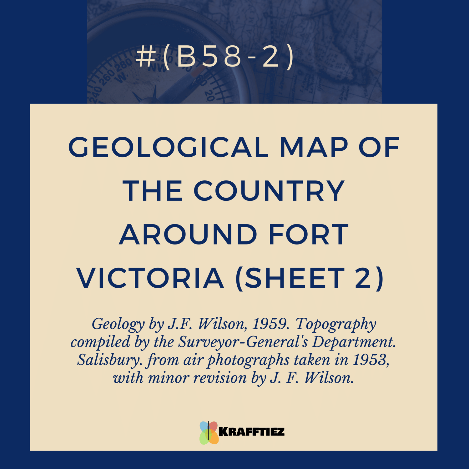Unlock the secrets of the earth with the B58-2 Geological Map of the Country Around Fort Victoria (Sheet 2). This map was created by the expert geologist J.F. Wilson in 1959 and features topography compiled by the Surveyor-General's Department. Air photographs taken in 1953 were used to create this map with minor revision by J.F. Wilson. Get a detailed look at the geological structure of the region with this map.