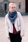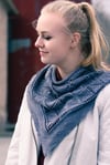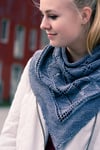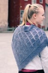 Yarn: Seven Sisters Arts Apex (60% superwash merino wool, 20% yak, 20% silk; 400 yards/366m/100g), shown in bleu grey; 1 skein, or 400 yards of wool blend fingering weight yarn with good drape. The sample as written used the entire skein; you may want to have additional yardage on hand as insurance, as the shawl may easily be enlarged using any amount of yarn.