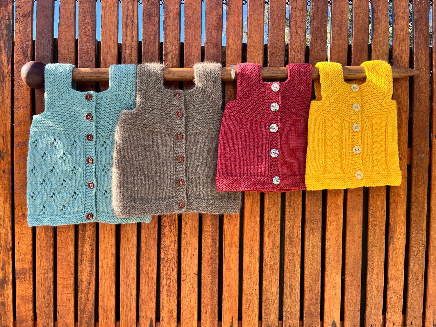 Samples shown in a variety of yarns. When substituting, the pattern is very forgiving but a wool-based yarn is recommended to provide some elasticity and memory through the yoke section.