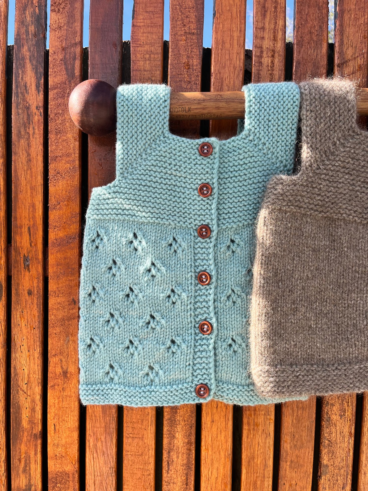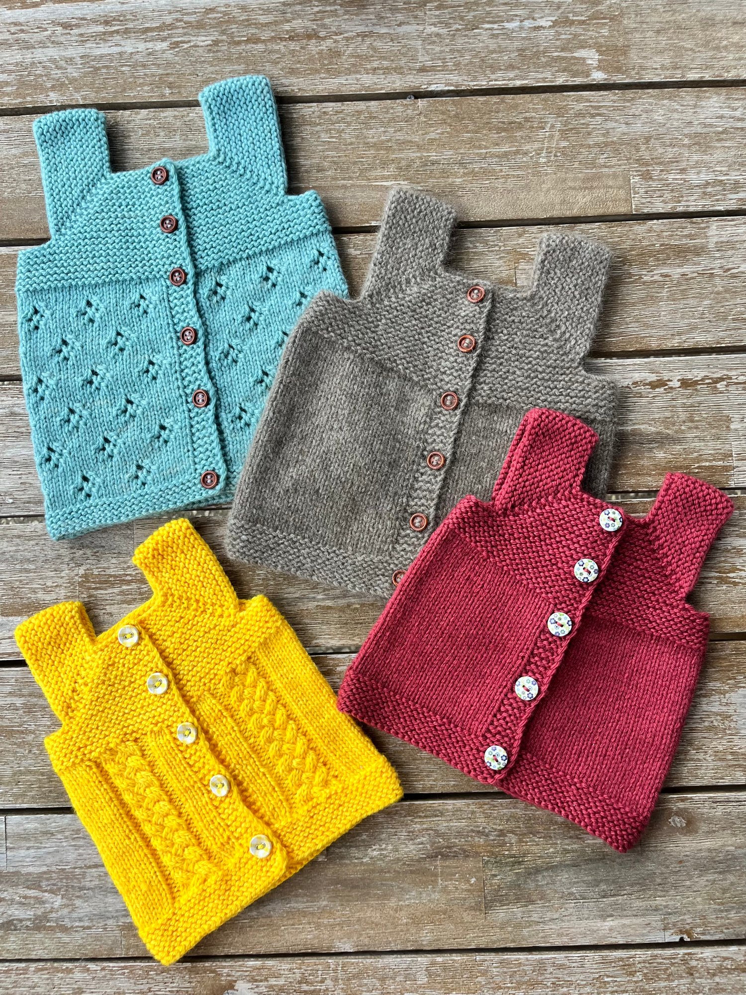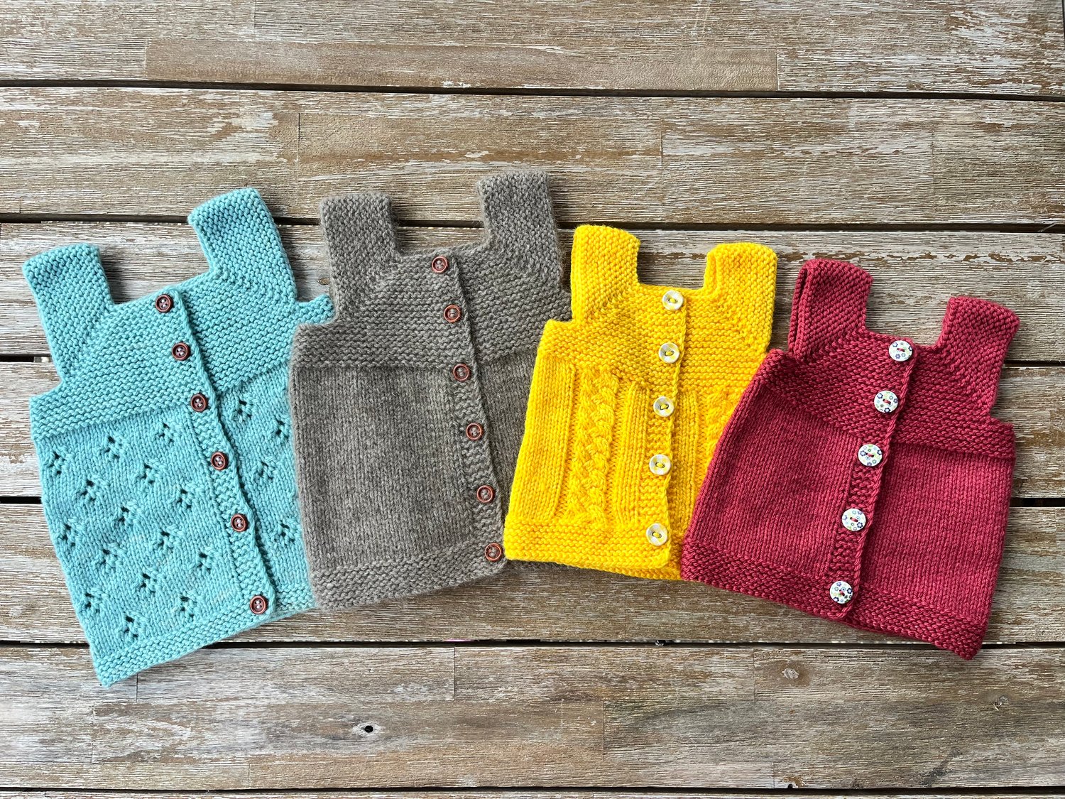 The shoulder straps are created by casting off stitches. The body is then knit flat with an integrated button band worked at the same time. Finishing details included to ensure the button band doesn’t flip inwards.
