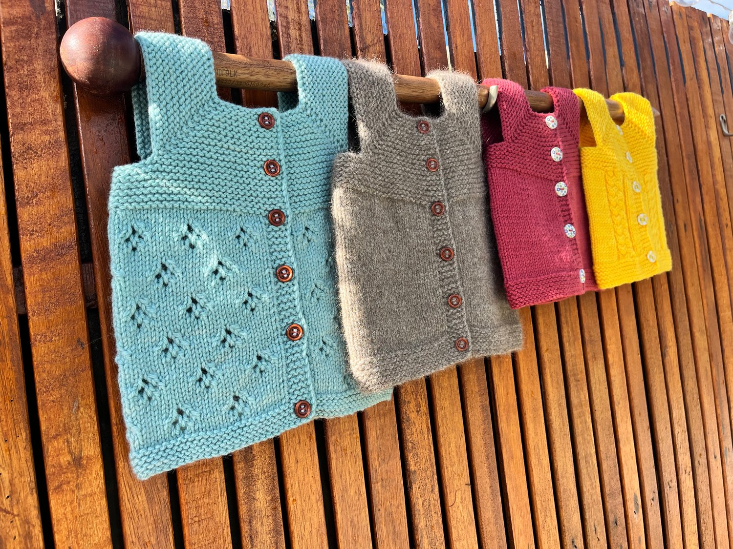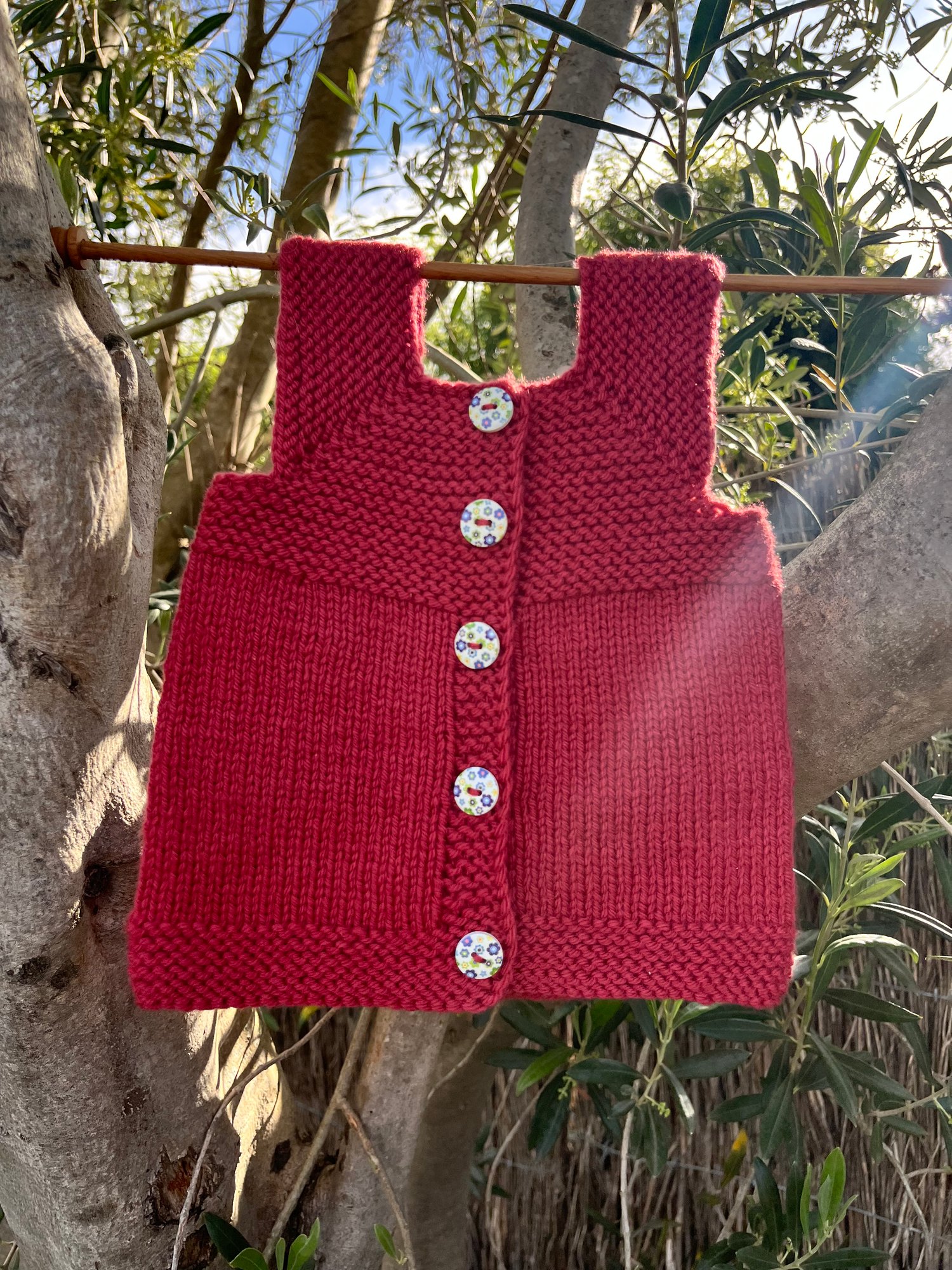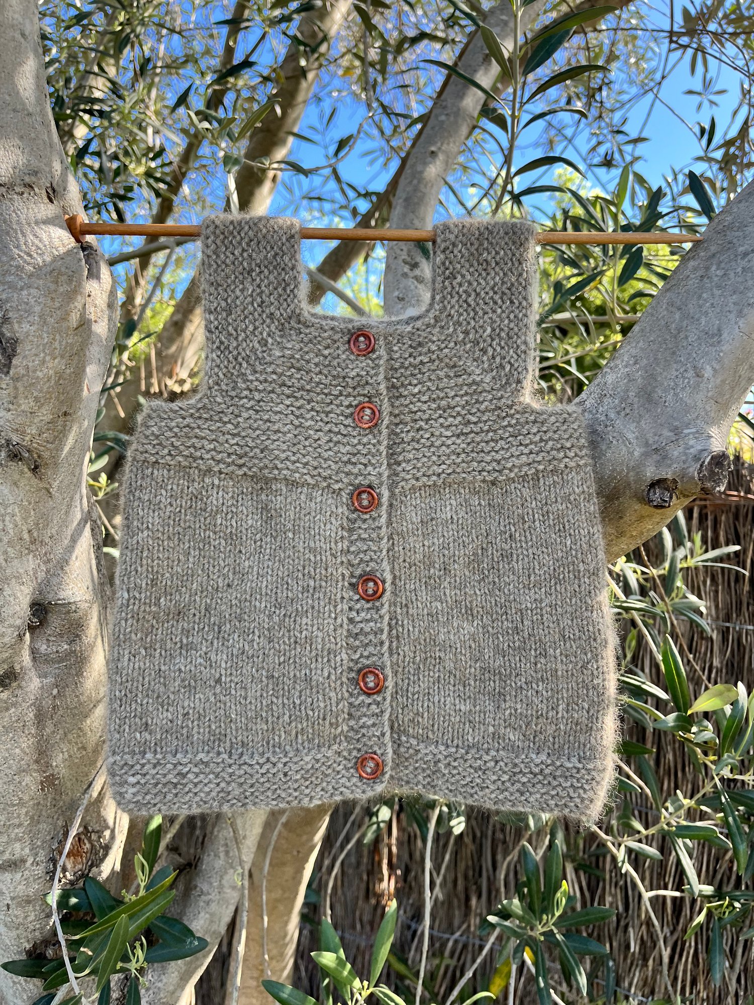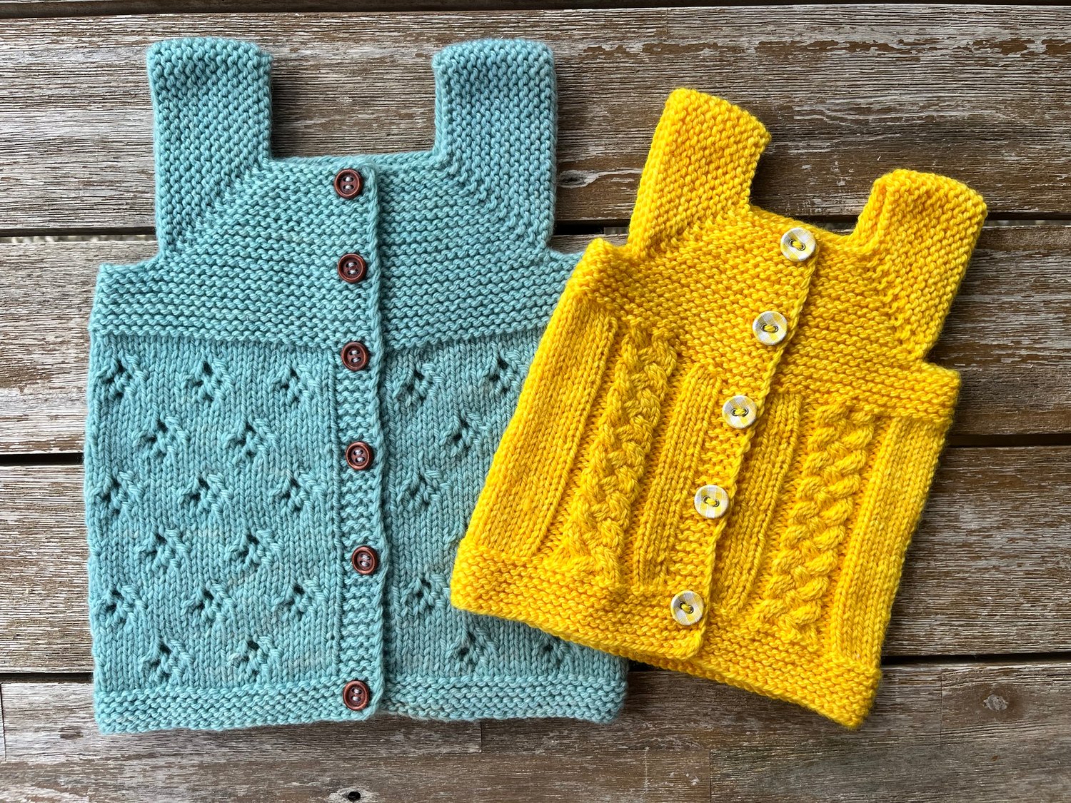 The shoulder straps are created by casting off stitches. The body is then knit flat with an integrated button band worked at the same time. Finishing details included to ensure the button band doesn’t flip inwards.