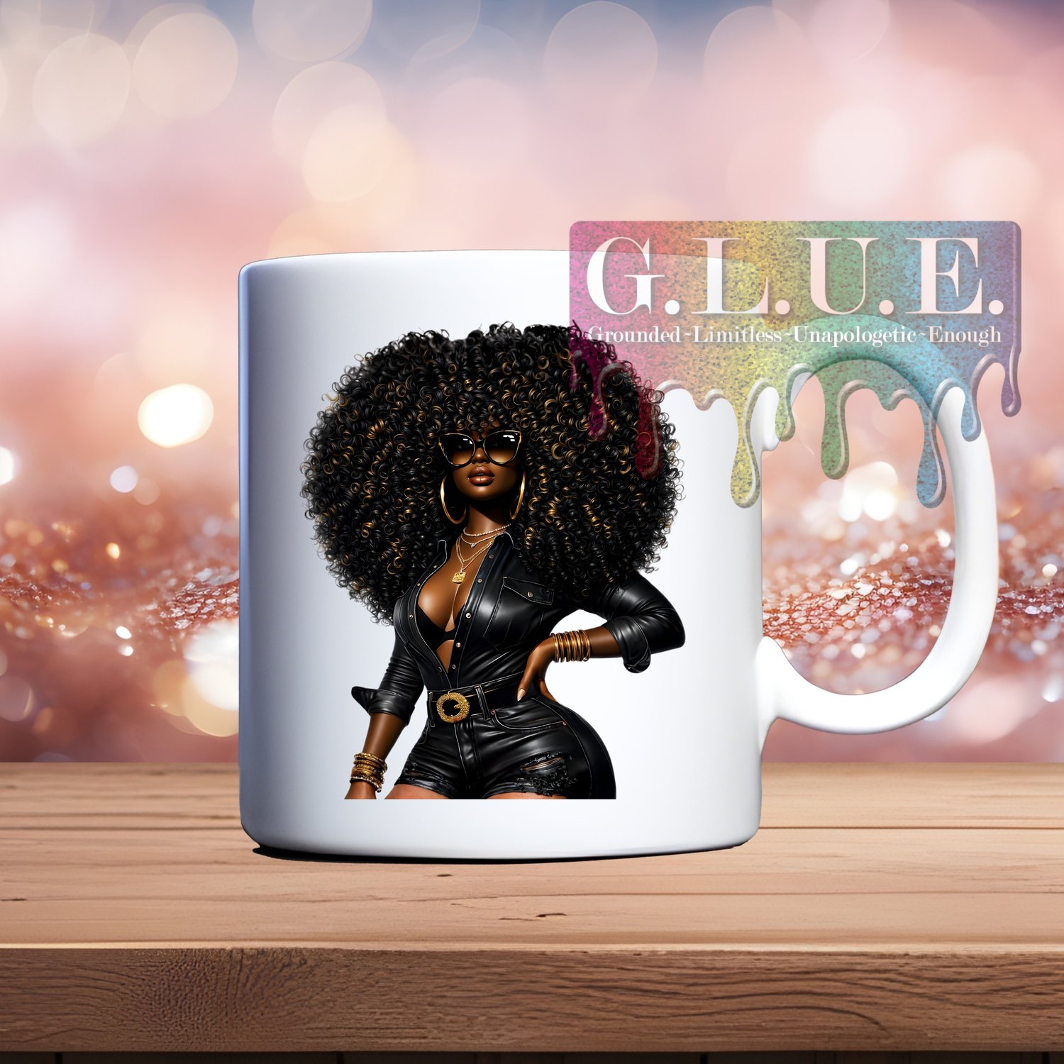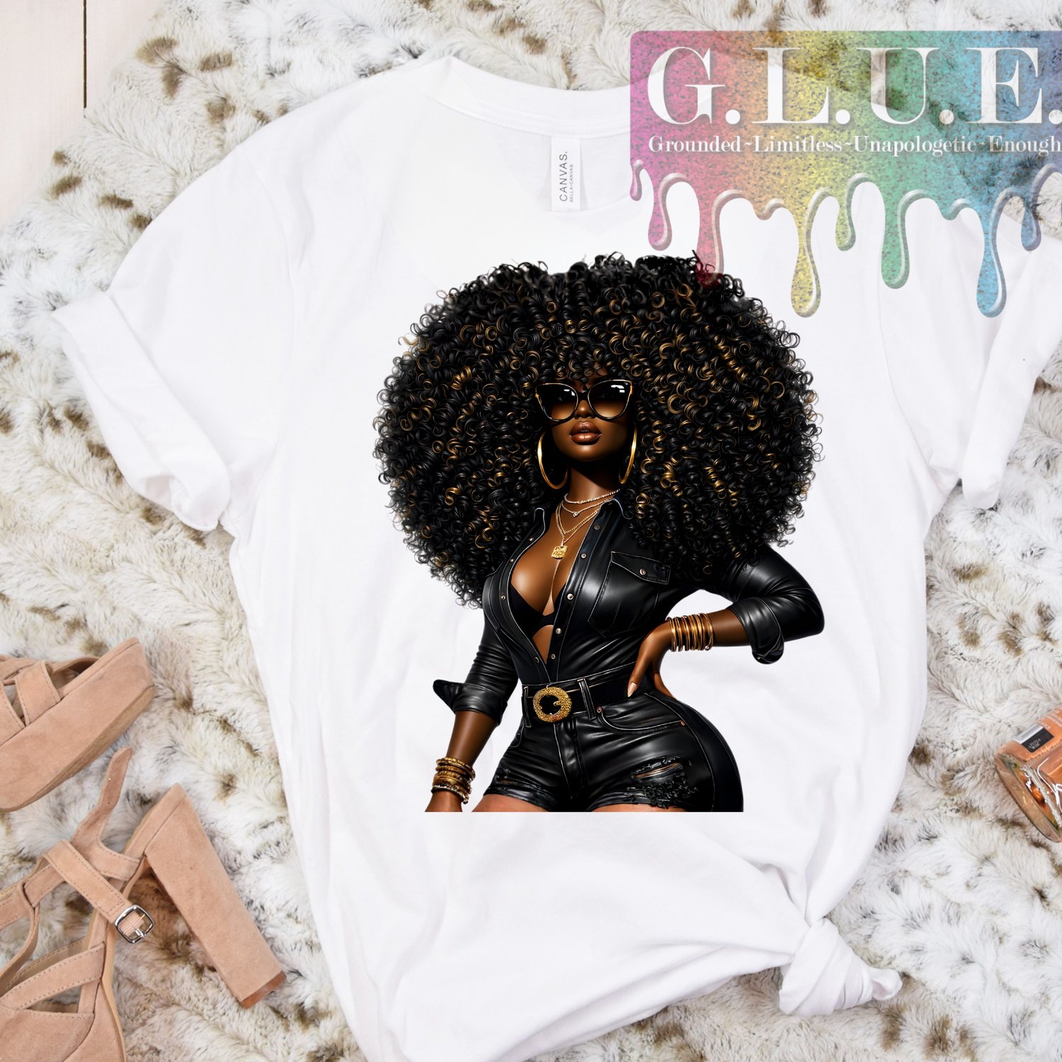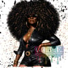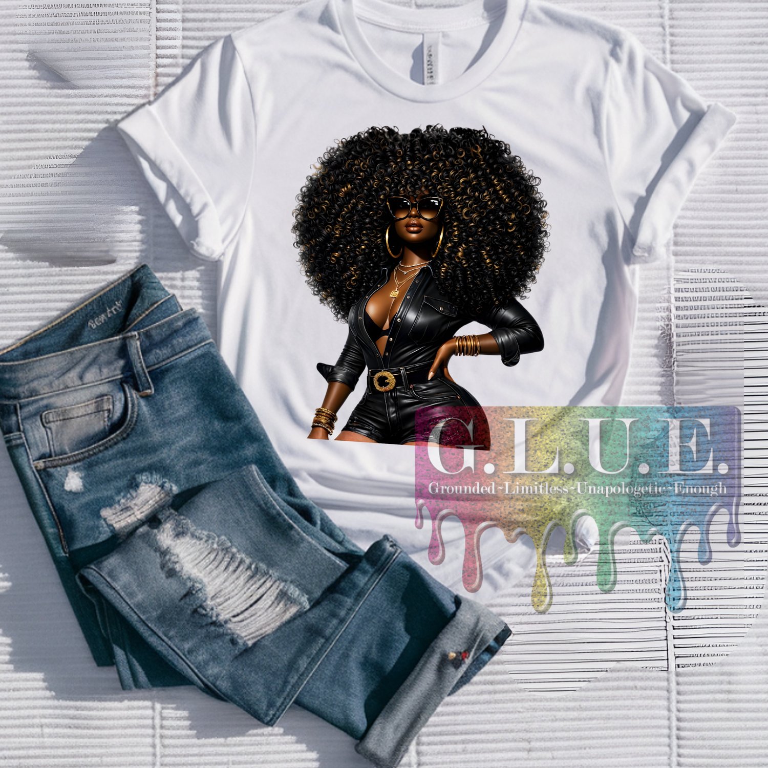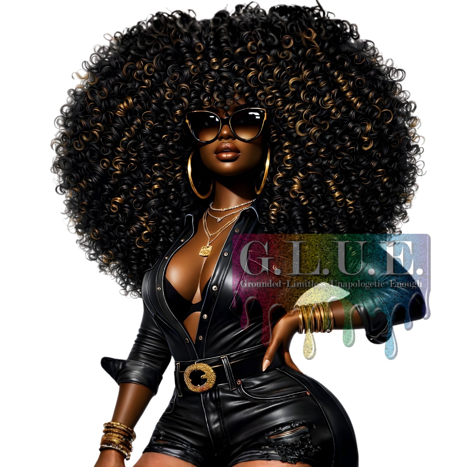This high-quality digital artwork features a stunning Black woman with a voluminous afro, flawless glam makeup, oversized sunglasses, gold jewelry, and a sleek leather outfit that radiates boss energy, confidence, and elegance. Perfect for creators, entrepreneurs, and brands that stand for empowerment and style.