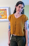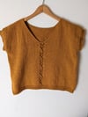 Mustard Flower is a loose fitting, boxy tee with a V neck, dropped sleeves, and a pretty floral lace detail in the center. The other side has a scoop neck, making this top reversible, and an extra versatile wardrobe staple.
