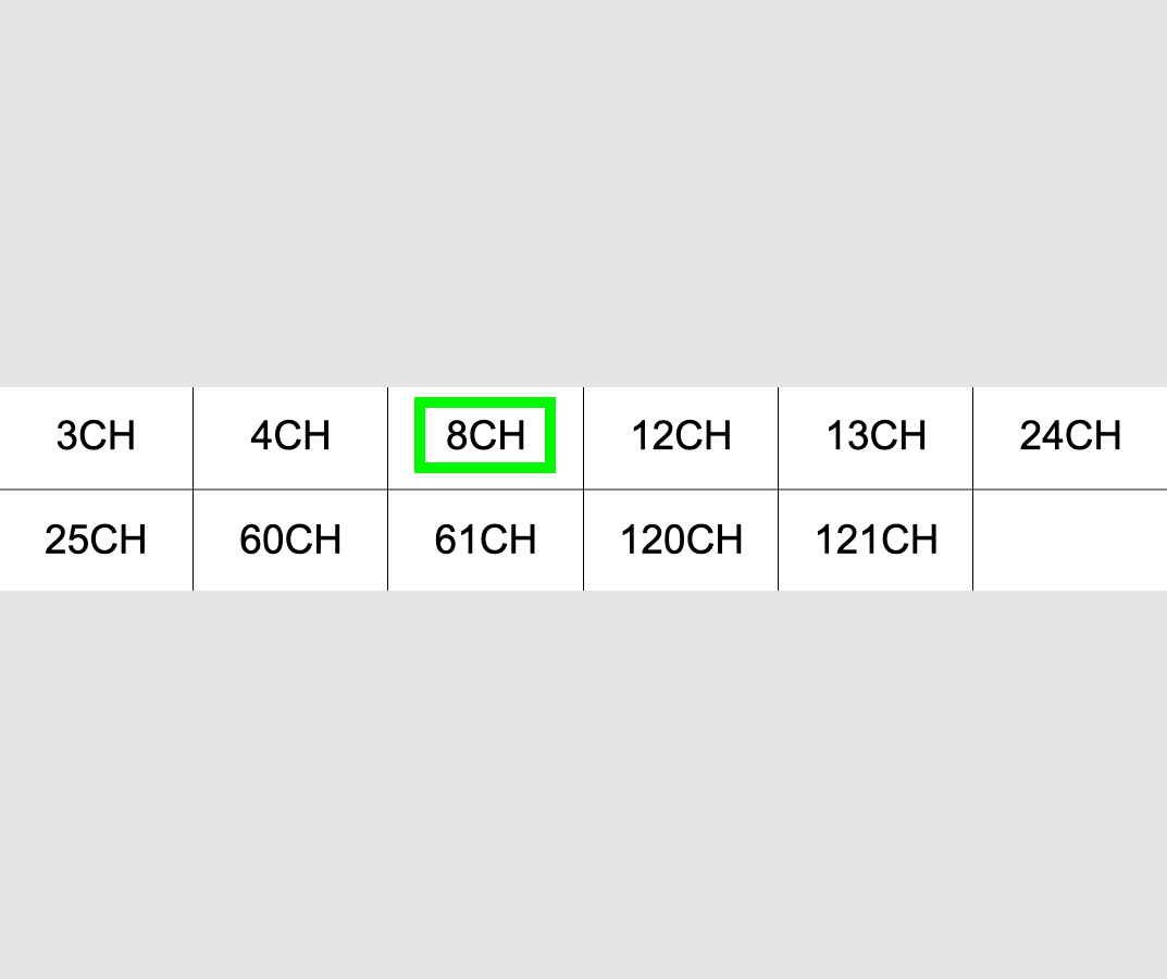 * Verifique, DESDE EL DISPLAY del equipo, que muestre los modos: 3CH, 4CH, 8CH, 12CH, 13CH, 24CH, 25CH, 60CH, 61CH, 120CH y 121CH (tercer imagen).