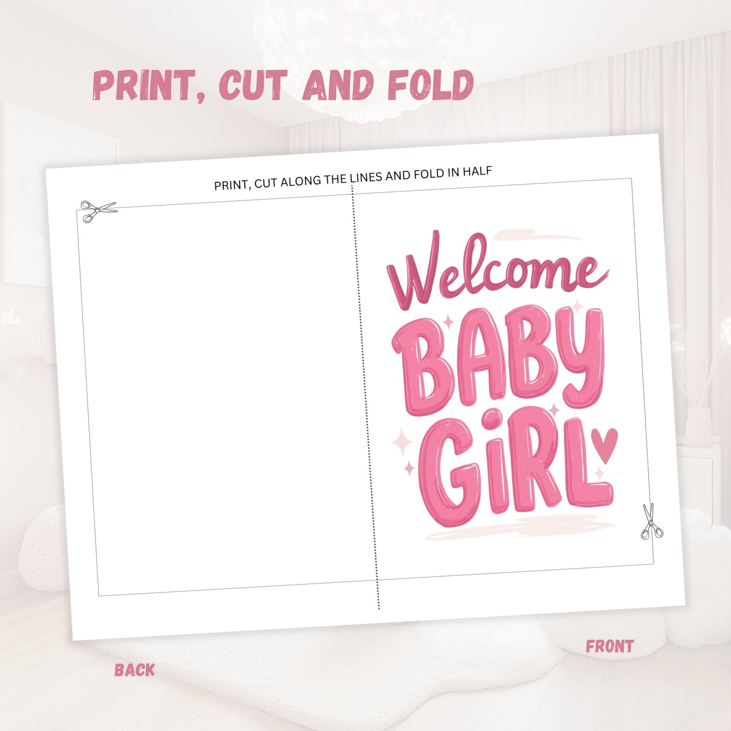 Celebrate the arrival of a sweet baby girl with this printable newborn baby girl card! Featuring a cute and simple design, in bold pink color, this welcome baby girl card is perfect for sending love and warm wishes to new parents.