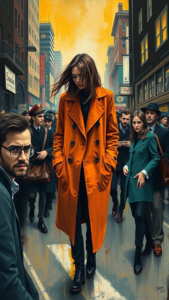 a woman in a long coat amidst a chaotic city scene. The artwork emulates the expressionist styles of Bacon, Schiele and Basquiat with bold strokes and distorted forms