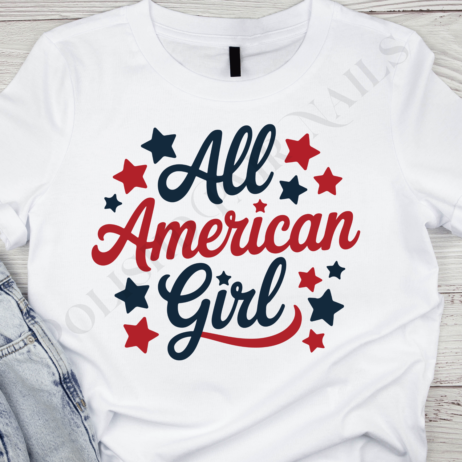 Celebrate your patriotic spirit with this adorable 'All American Girl' t-shirt! This charming design features the phrase 'All American Girl' in a delightful mix of red and blue fonts, surrounded by a festive burst of red and blue stars of various sizes. It's a sweet and stylish way to show off your American pride.