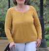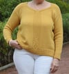 The body is knit in the round from the bottom up to the armhole shaping, the front and back are then each worked flat. Sleeves stitches are picked up along the armhole, worked flat for several rows and then knit in the round to the cuff.