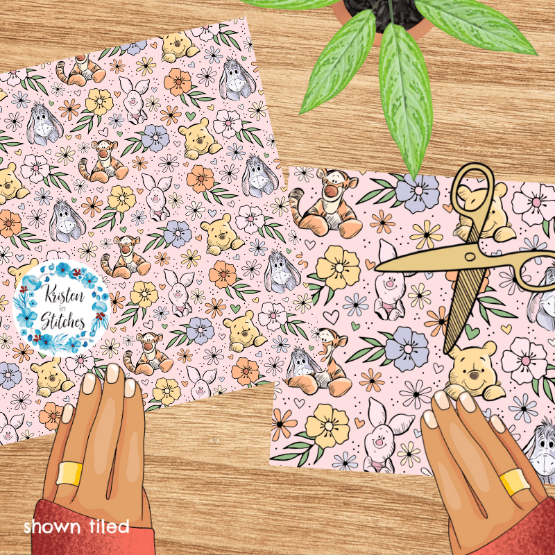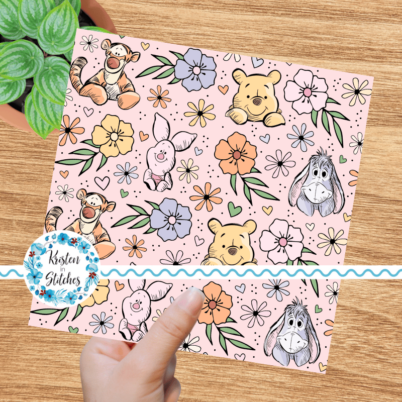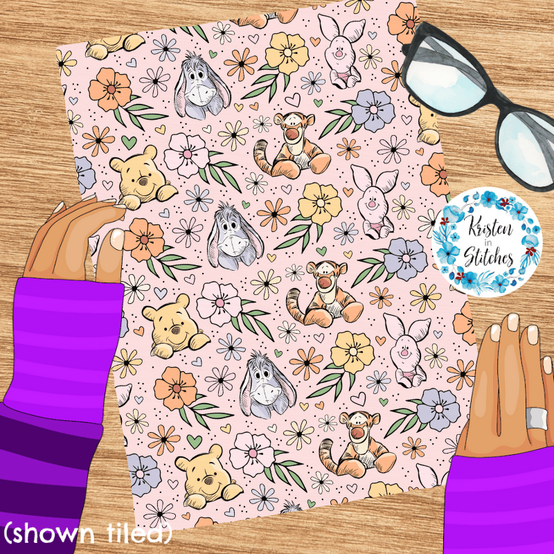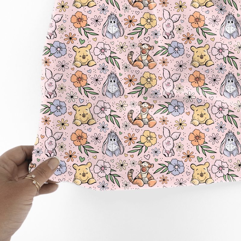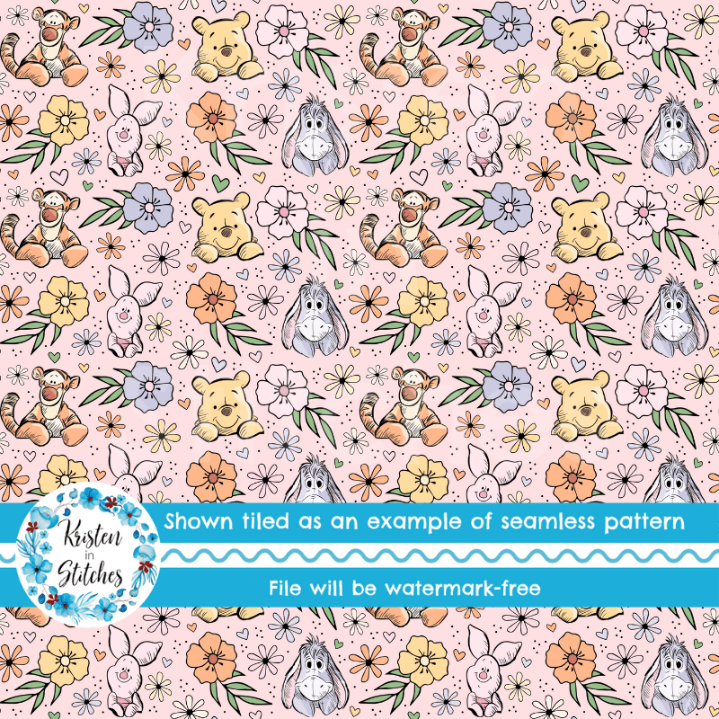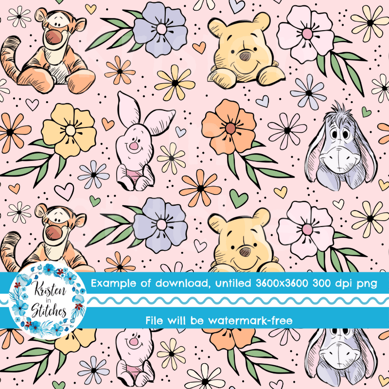 Classic Winnie the Pooh Piglet Tigger Eeyore Nursery Floral Seamless Pattern, Pink