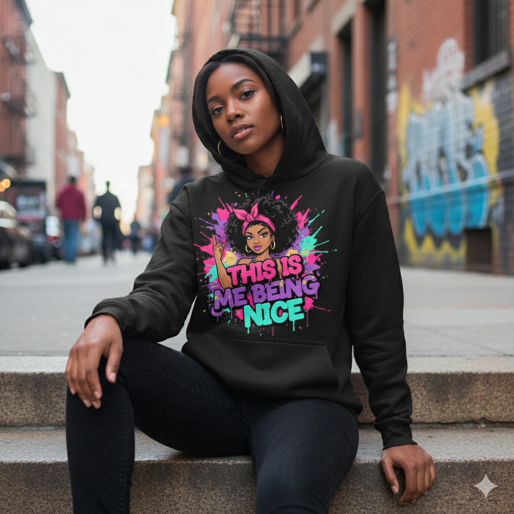 Level up your merchandise with this bold and vibrant "This Is Me Being Nice" Digital PNG Design! Featuring a confident Black woman with a natural curly afro and a "not today" attitude, this high-quality illustration is perfect for creators looking to add some sassy, urban flair to their products. Inspired by modern street art, the design combines gritty graffiti elements with a luxury pop-art palette of hot pink, purple, turquoise, and gold glitter accents.