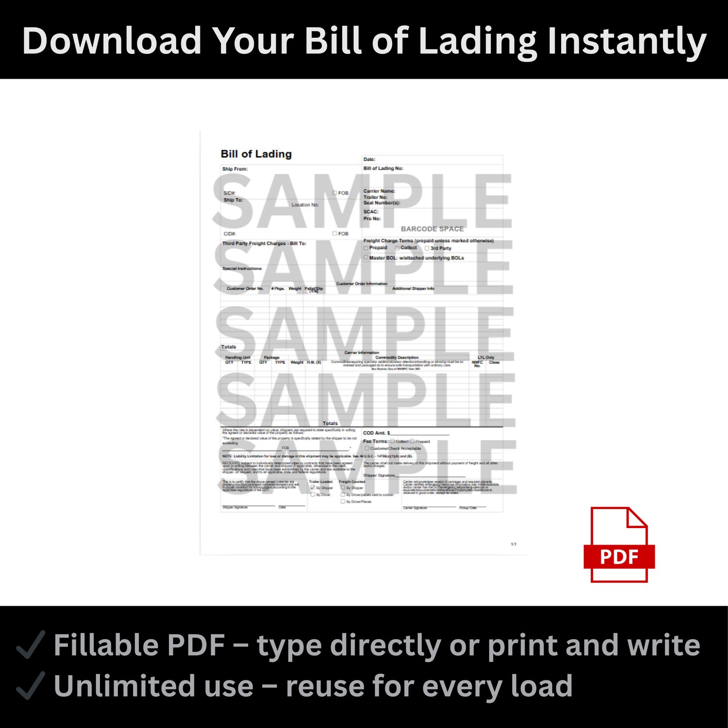 Streamline your freight paperwork with this easy-to-use, printable Bill of Lading template. No more overpaying or scrambling last minute – simply download, fill in your shipment details, and print. Perfect for owner-operators, small fleets, brokers, and shippers who need a professional BOL without the extra cost.