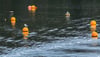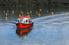 Here the ferry is just coming over to the Fowey side to drop off a few passengers. The bright orange of the ferry, along with the flotilla of yellow buoys, is set against the mesmerising ripples on the water, which reflect the boat and blue sky.