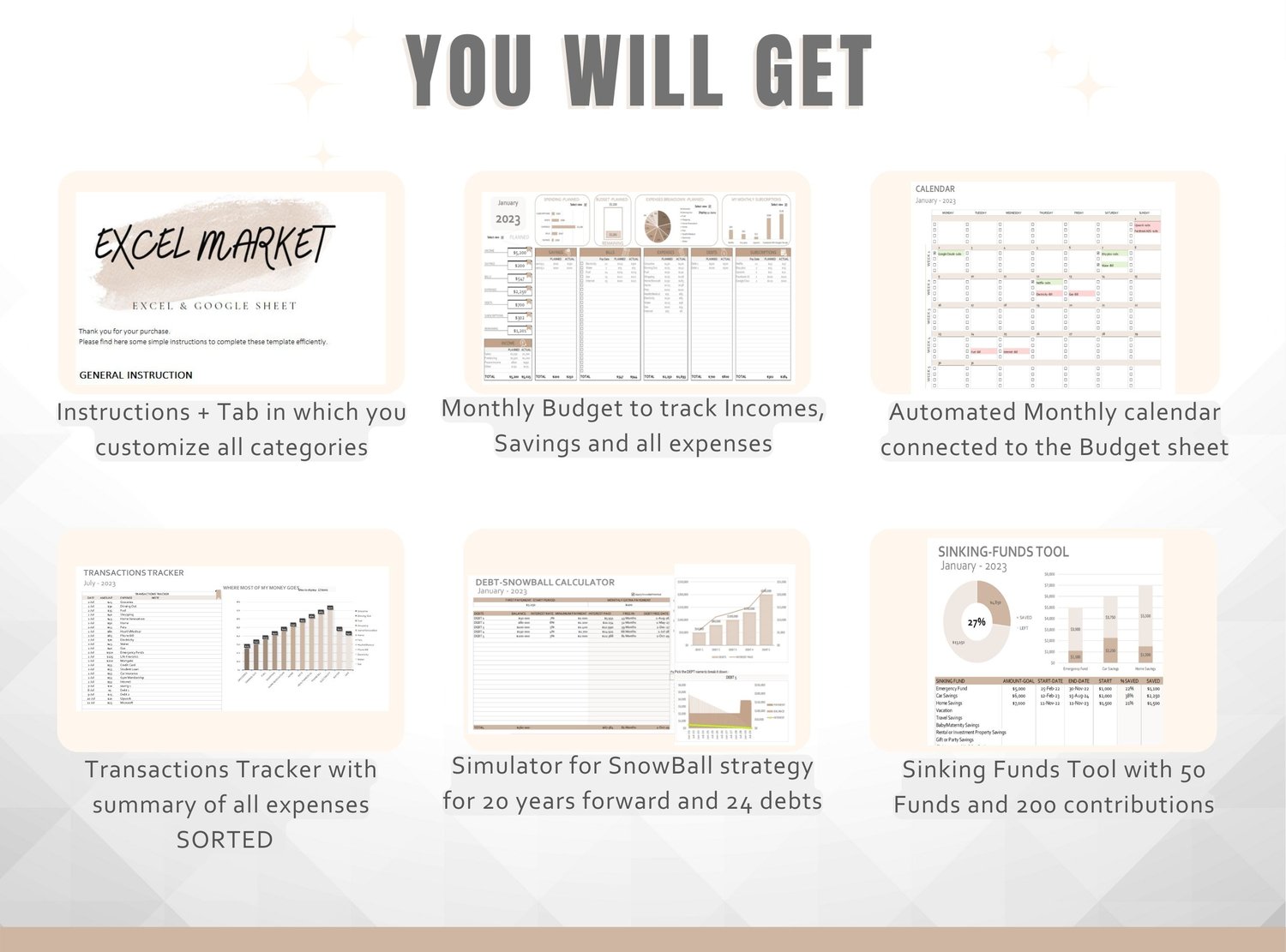 Brown Monthly Budget + Debt snowball+Calendar+Sinking Funds