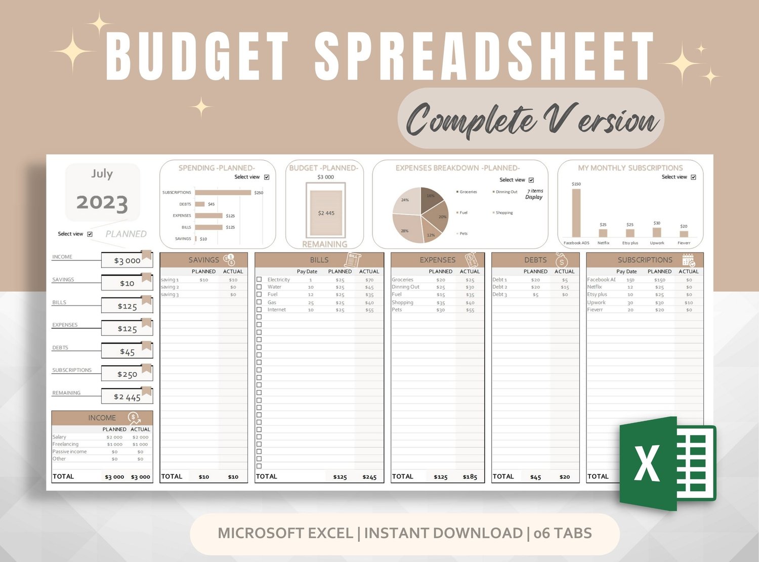 - Monthly Budget in which you fill your PLANNED : incomes, debts, savings, expenses, Bills and subscriptions