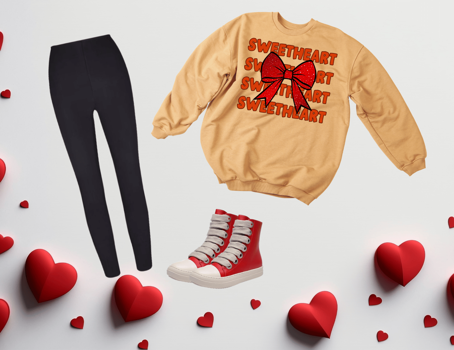 Fall in love with our Valentine Sweetheart Bow Sweatshirt—the perfect blend of cozy comfort and charming style! Featuring a delicate bow design and a sweet "Sweetheart" message, this sweatshirt is your go-to for celebrating love and spreading joy.