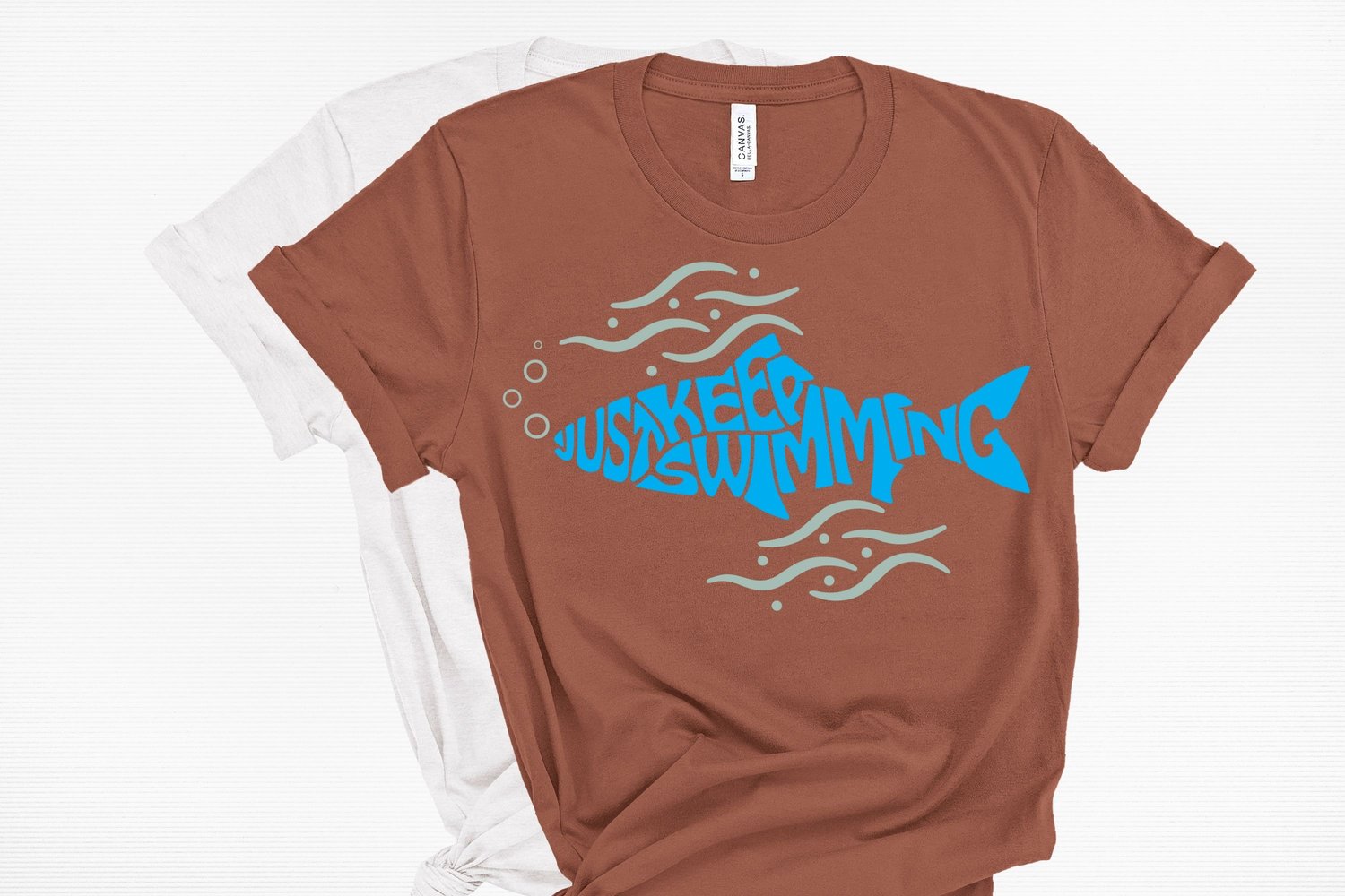 This design features the words Just Keep Swimming creatively made into the shape of a fish.