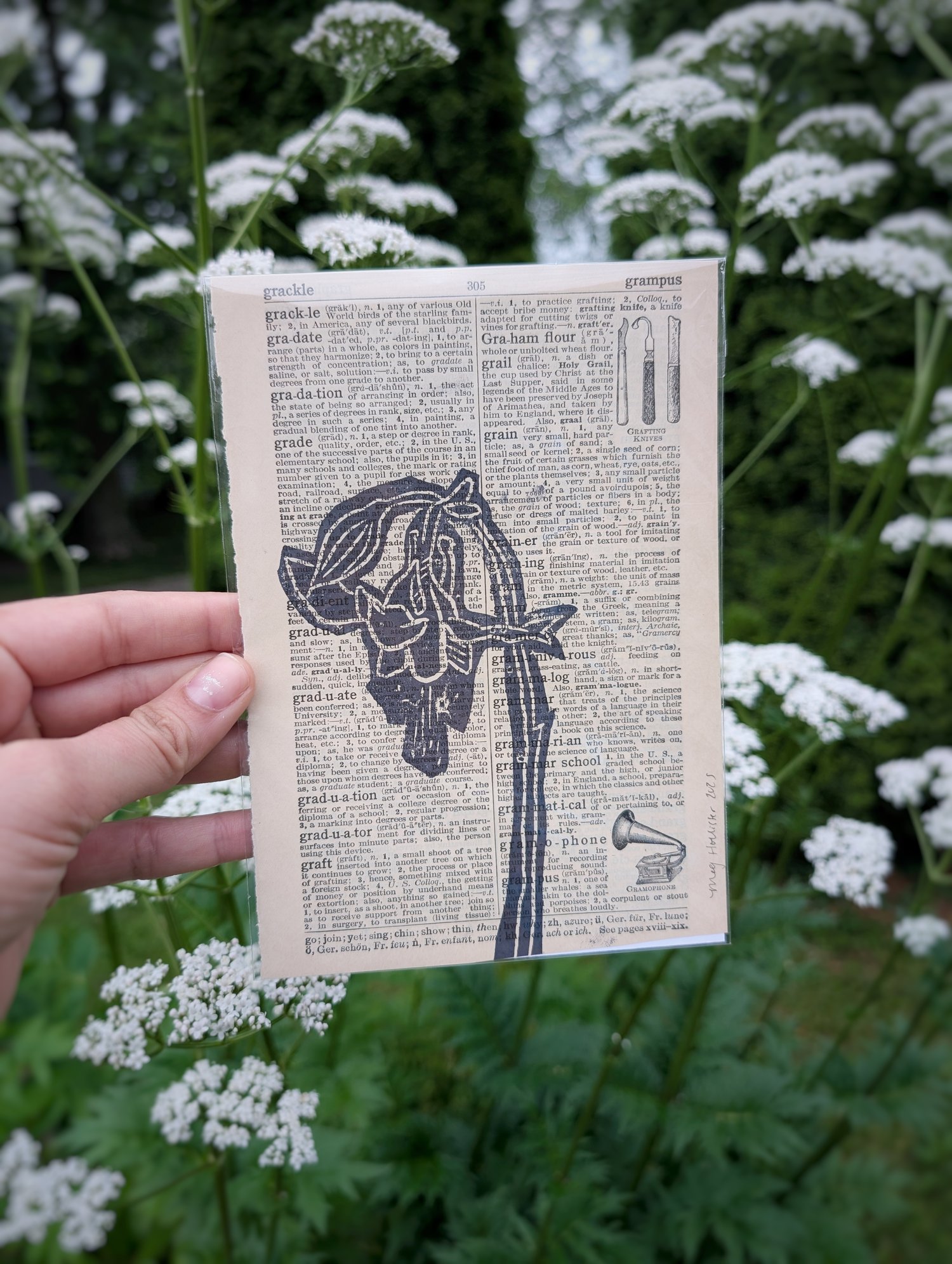 5x7 inch hand illustrated linocut print on vintage illustrated dictionary pages. These pieces are truly one of a kind- due to the nature of book pages and the nature of lincout prints, each print is going to look a bit different and feature slightly different book page illustrations.