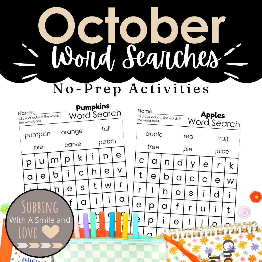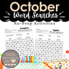 October Word Searches No-Prep Activities for Kindergarten through 2nd grades
