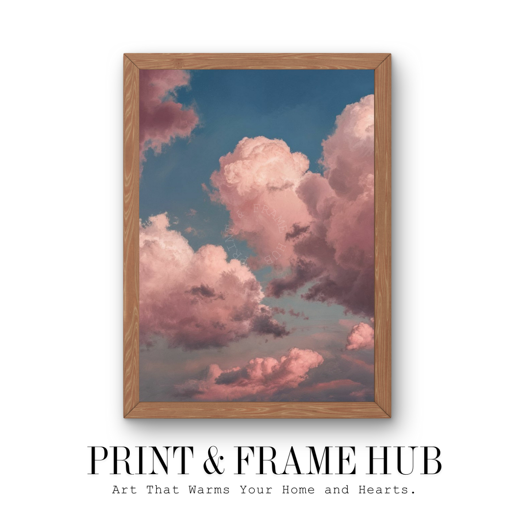 This serene painting of pink clouds against a dusky blue sky features soft colors and a tranquil composition. Ideal for any home, it adds a touch of calm and elegance to your living space, making it perfect for the living room, bedroom, or hallway.
