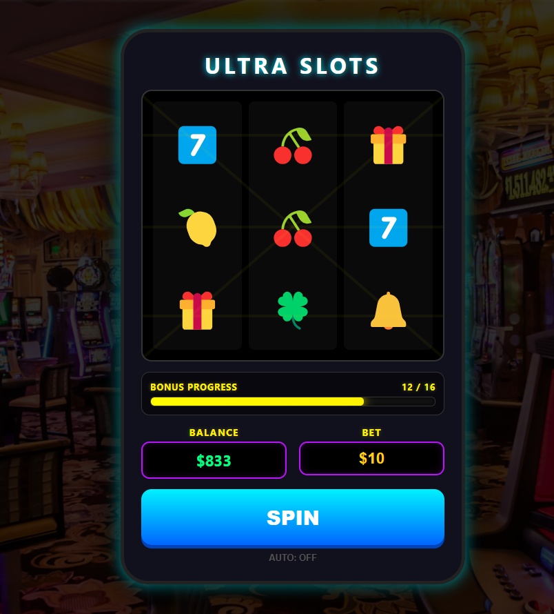 Complete slot machine logic — spin animations, random outcomes, payouts, and balance tracking.