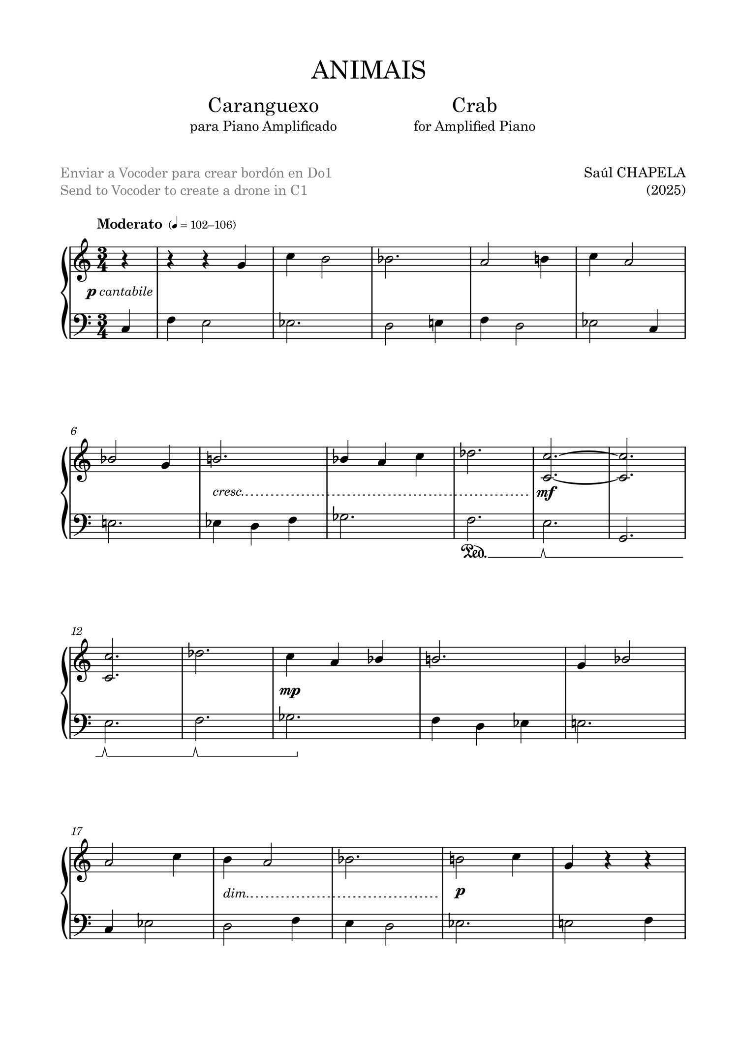 Crab for amplified piano uses a Vocoder to generate a drone and contrapuntal techniques of canon and retrograde motion.