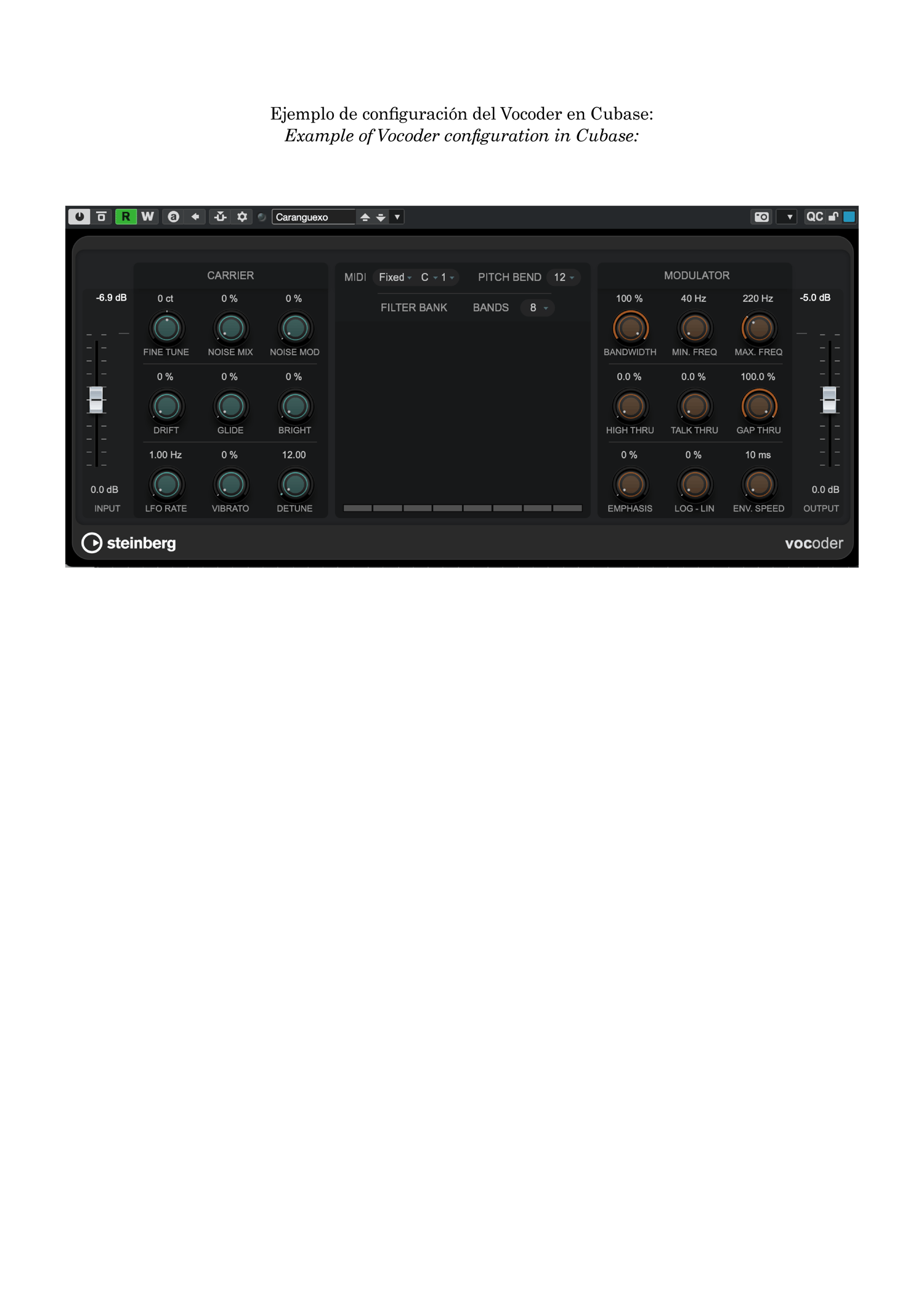 Caranguexo para piano amplificado emplea un Vocoder para generar un bordón y técnicas contrapuntísticas de canon y movimiento retrógrado.