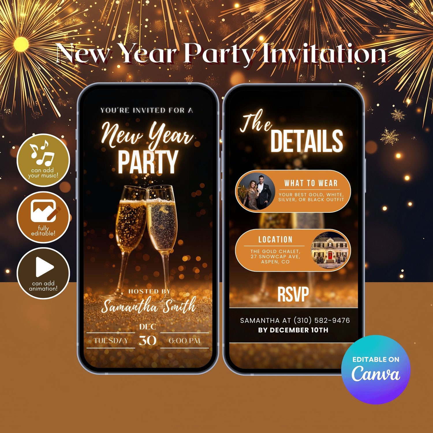 ⭐ New Year Party Digital Invitation Template | 2 Editable Animated Canva Pages | NYE Party Invite 2026 ⭐