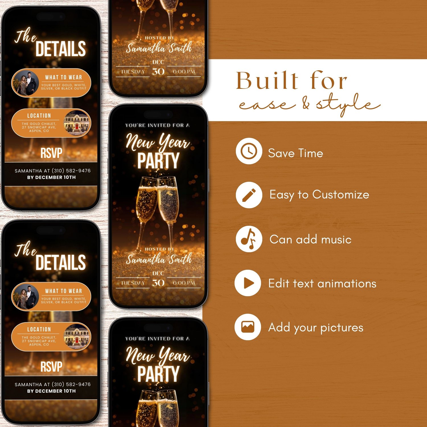 New Year Invitation, New Year's Eve Party Evite, Black & Gold New Year Party Invite, NYE 2026 (Animated Canva Template)
