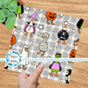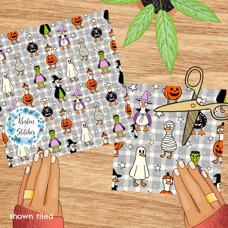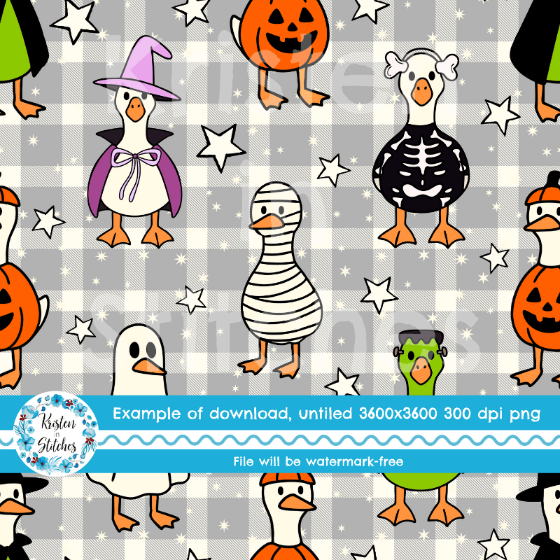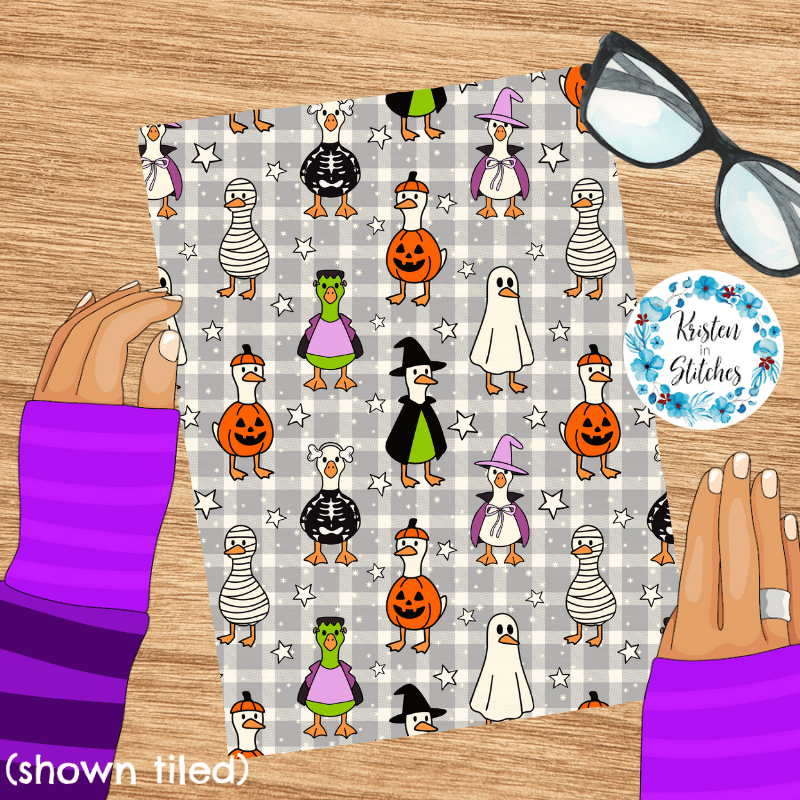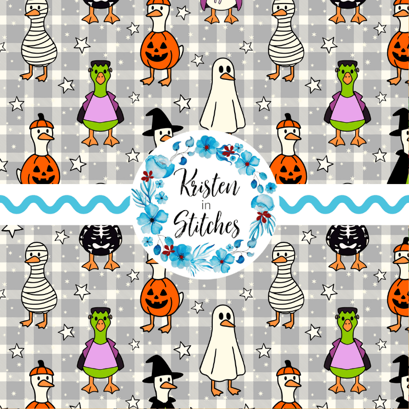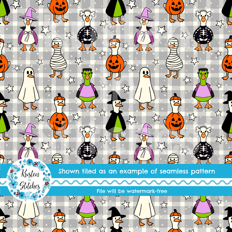 Silly white geese in costumes, ready for trick or treat night! Features ducks dressed as a ghost, mummy, frankenstein, pumpkin, witch and skeleton on grey gingham plaid.
