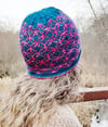 Dark teal/pink brimless hat shown in Malabrigo Rios in Teal Feather (MC) and English Rose (CC).