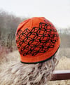 Orange/dark green brimmed hat shown in Spirit Trail Fiberworks Verdande in Fresh Tomato (MC) and The Dark Before Dawn (CC).