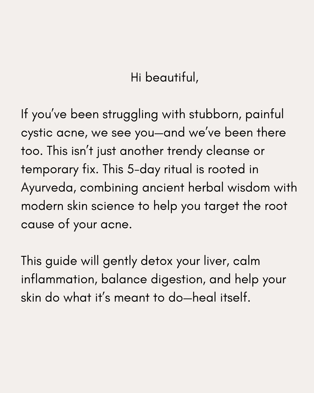 This 29-page Ayurvedic Detox Guide gives you 5 science-backed, skin-clearing drink rituals that work from the inside out — because the real cure to cystic acne starts deep within.