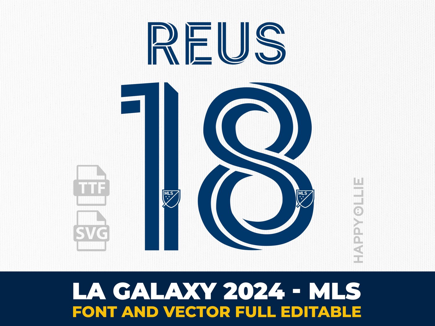LA Galaxy, Home MLS font jersey 24-25 vector 2024 pdf, svg, ttf, Reus, Riqui Puig, MLS Champions Shirt Numbers