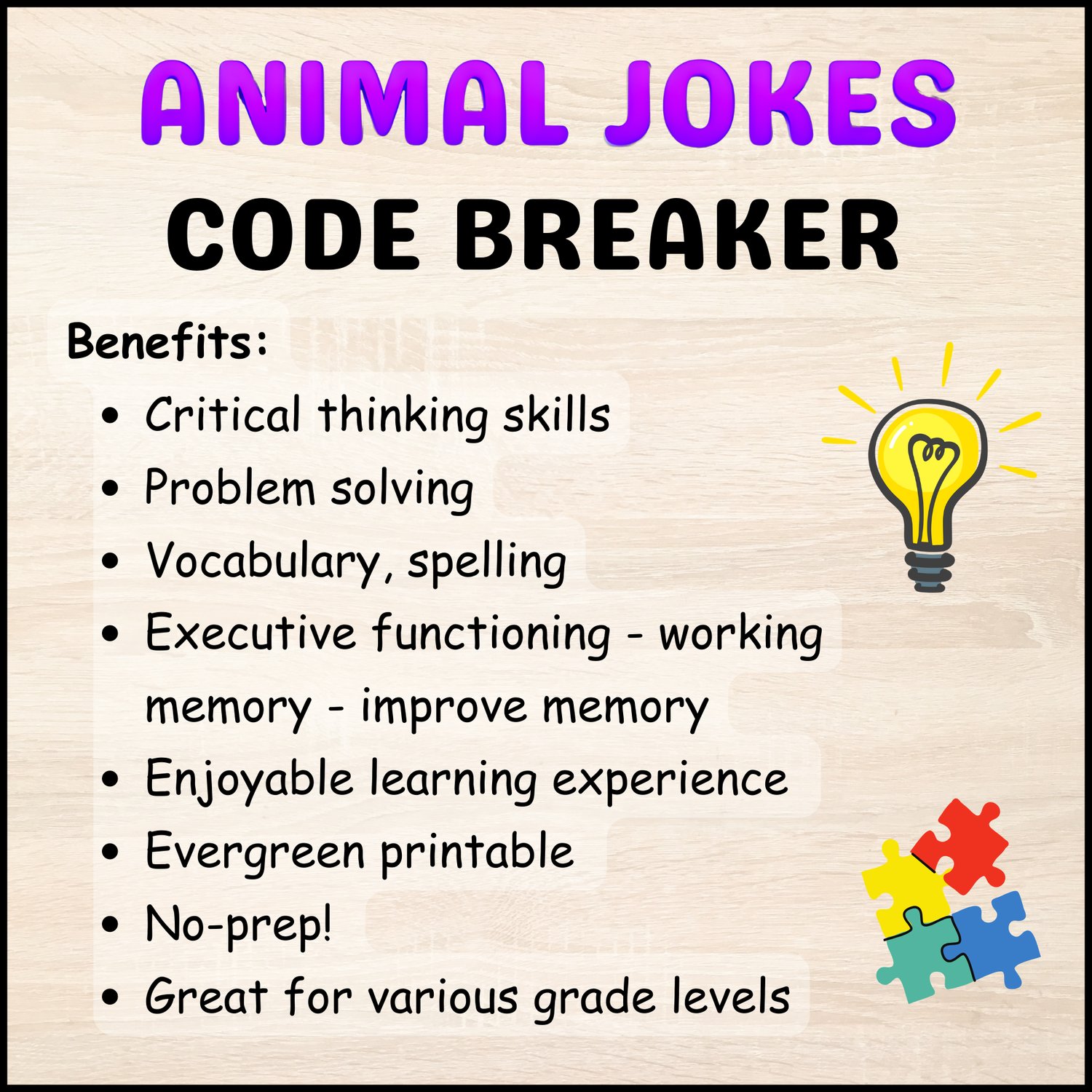 Looking for a way to engage your students while enhancing their critical thinking skills? Check out Animal Jokes Code Breaker Cryptogram! This activity combines fun and learning, providing students with 15 hilarious animal jokes to decode.