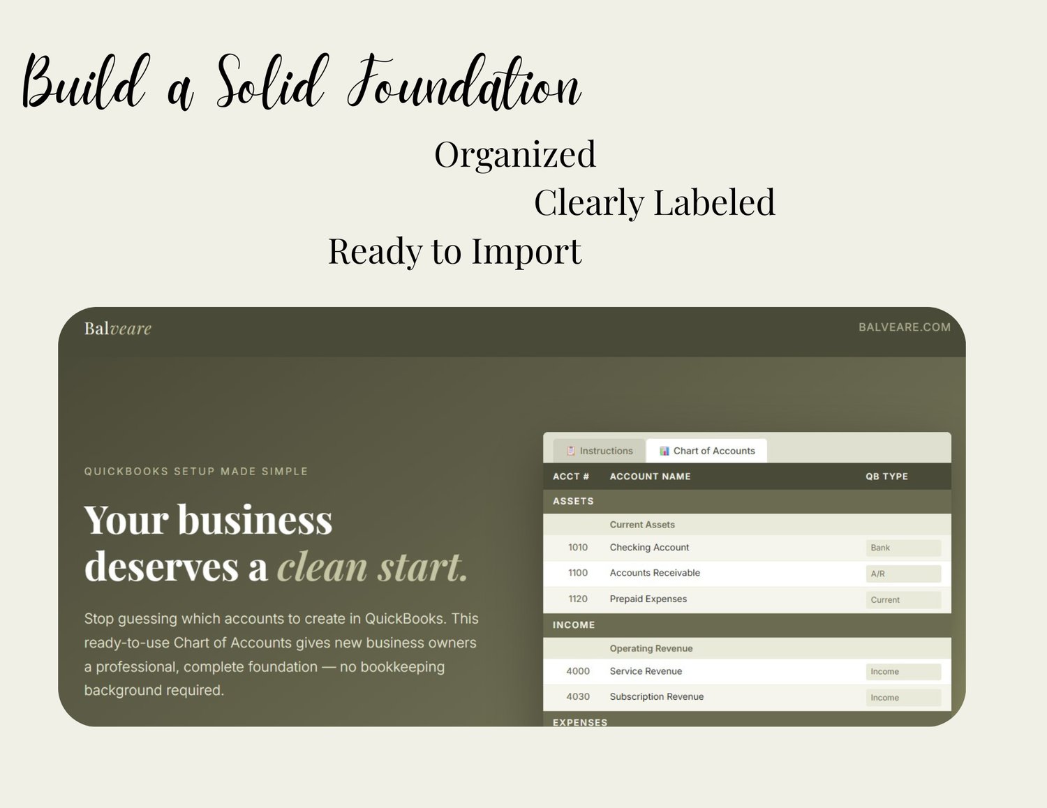 - Exact QuickBooks labels — every account includes the precise Account Type and Detail Type that QuickBooks expects, so setup is straightforward