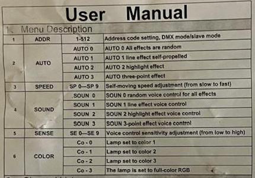 * En el modo "Co-3" Verifique, con un Fixture de pruebas (click), que coincidan estos canales: 1 en el valor 50 = Modo manual, 3 en el valor 30 = Color Azul, 5 Figuras, 6 tamaño de las figuras.