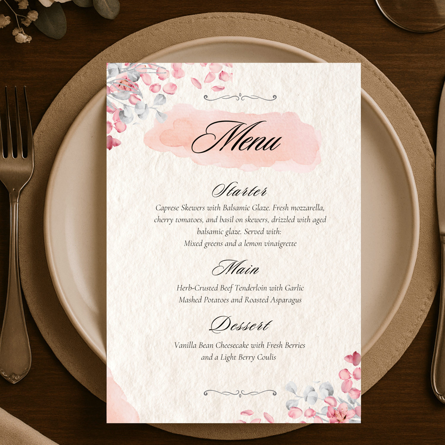 Bring a soft and romantic touch to your wedding table with the Flower Wedding Menu – a delicate, watercolor-inspired design featuring blush floral accents and elegant typography. This wedding menu template is ideal for couples looking to add refined charm and cohesive style to every place setting.