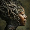 A woman’s profile emerges from ancient roots and living soil, her form shaped by land, memory, and lineage. The roots woven through her crown and skin represent what cannot be severed — the bond between body and ancestry, between blood and ground.