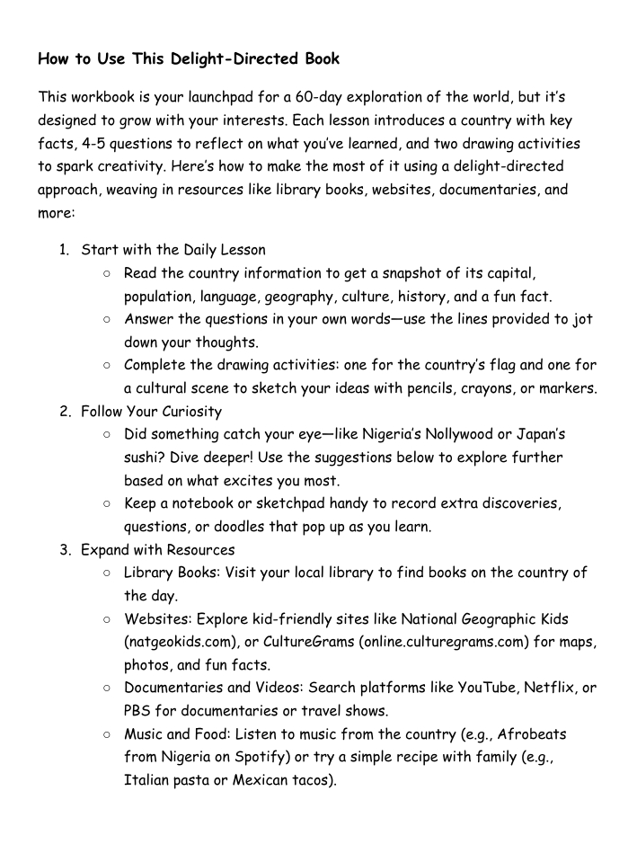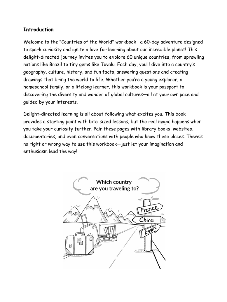 Designed for delight-directed learning, this workbook blends education with creativity. Answer thought-provoking questions to reflect on what you’ve discovered, and bring each country to life with two drawing activities: one for its flag and another for a colorful cultural scene. Whether you’re a homeschooler, a young explorer, or a lifelong learner, this book adapts to your pace and passions—spend a day or a week on each country, and dive deeper with suggested resources like library books, documentaries, and websites.