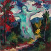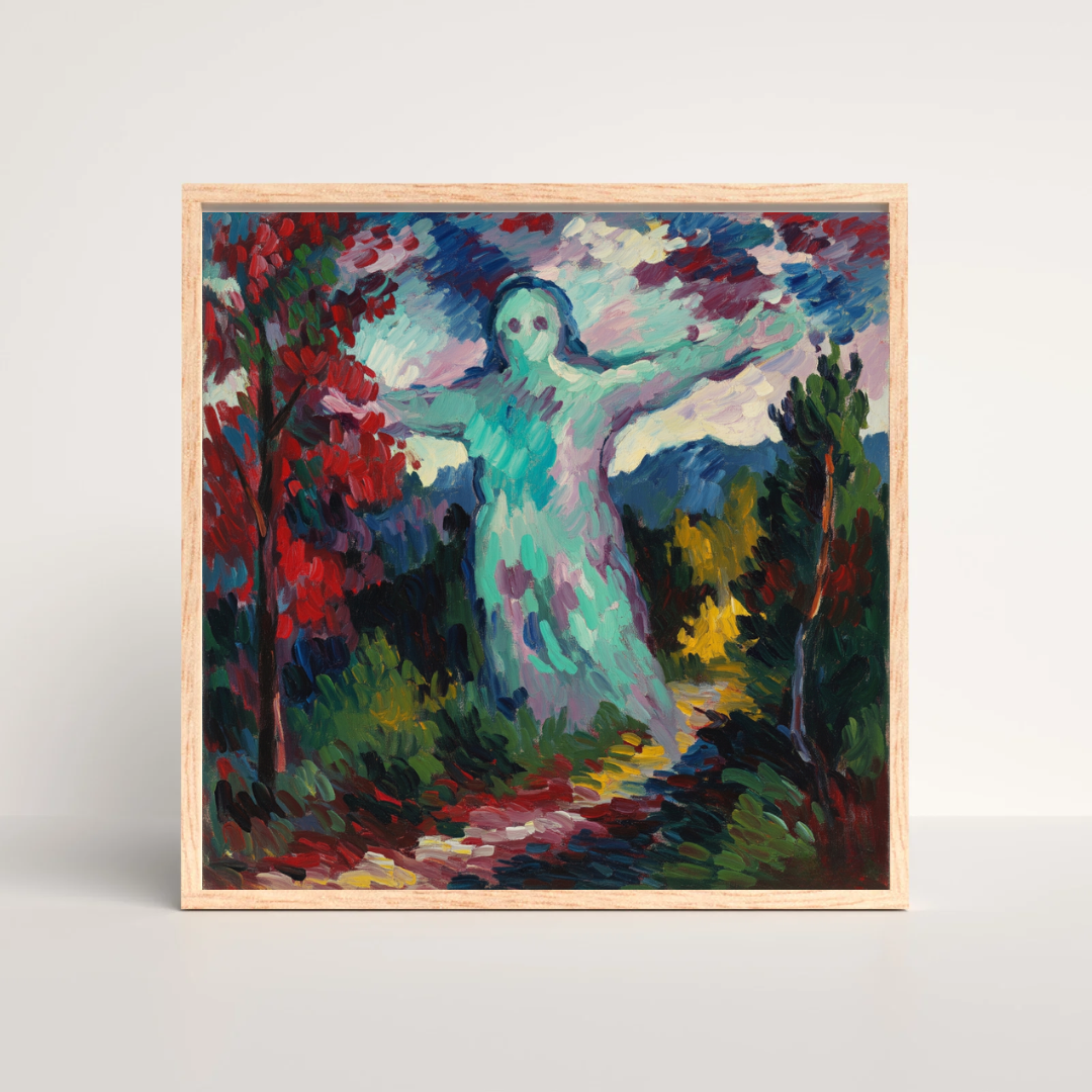 A ghostly figure appears in a colorful forest, blending mystery and beauty in a haunting Halloween scene.