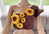 Eine elegante One-Shoulder-Bluse mit gehäkelten Sonnenblumen und Erdtönen, perfekt für den Sommer. Dieses Kleidungsstück stellt ein Sonnenblumenfeld mit grünen Blättern über verschlungenen Wurzeln dar, die sich in den unregelmäßigen Stichen an den Rändern widerspiegeln. In diesem Fall sind die Ärmel kurz, aber es ist möglich, den gleichen Stich auch mit langen Ärmeln zu machen. Es ist perfekt für jeden Sommeranlass. Stellen Sie sich vor, Sie ziehen dieses frische und leichte Oberteil nach einem Tag am Strand an, um mit Freunden auszugehen oder ein Festival zu besuchen.