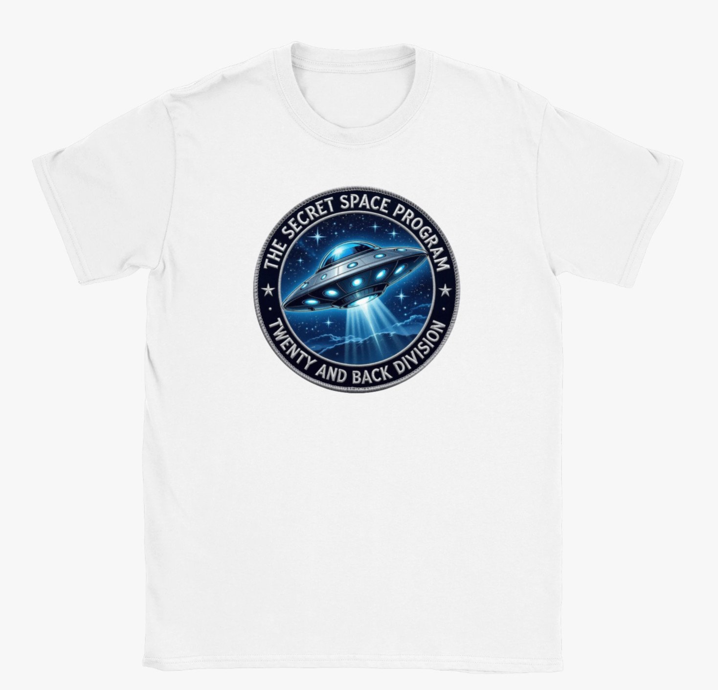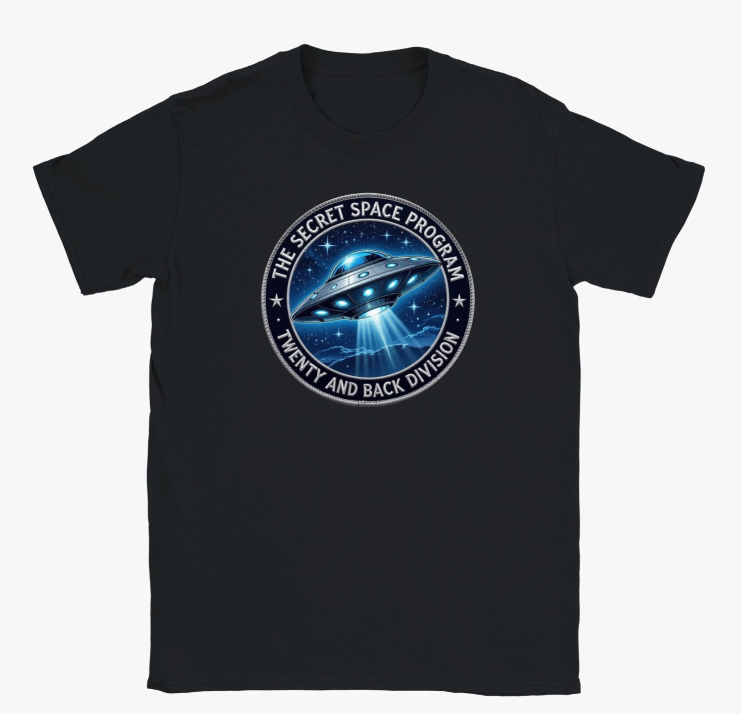 Step into the mystery with this bold Secret Space Program “Twenty and Back Division” t-shirt. Featuring a striking UFO emblem set against a star-filled galaxy backdrop, this design pays tribute to one of the most intriguing modern space legends. The circular patch-style graphic gives it an authentic mission insignia look, perfect for sci-fi enthusiasts, UFO researchers, and anyone who loves cosmic conspiracies.