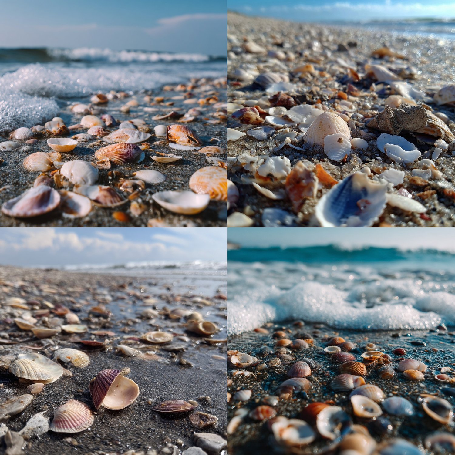 Generate a hyper-realistic close-up of a sandy beach scattered with broken and whole seashells under bright, optimistic weather. Perfect for nature photography, digital backgrounds, relaxation visuals, or beach-themed art. Keywords: beach close-up, seashells, sand textures, sunny weather, optimistic atmosphere, nature photography, realistic coastal scene.