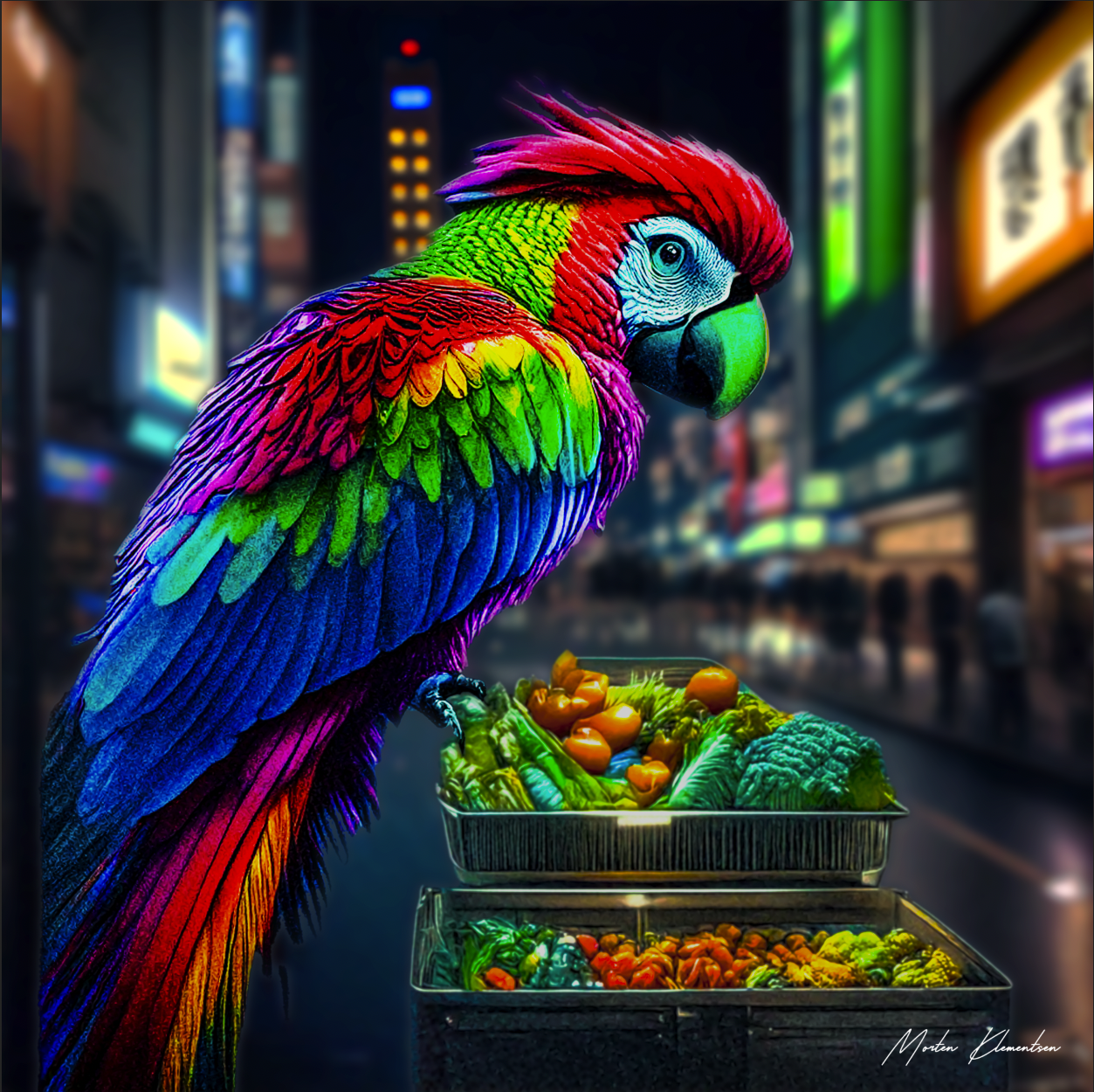 #mortenklementsen #DigitalArtwork #ColorfulParrot #UniqueArtPiece #ArtCollector #ArtForSale #ContemporaryArt #VisualStory #CreativeDigitalArt #TokyoStreet #UniqueGiftย