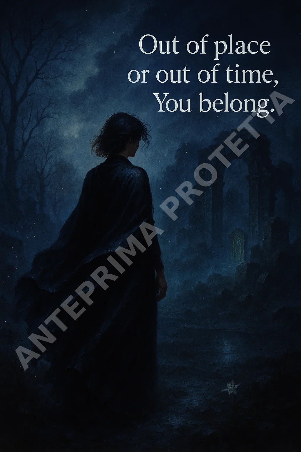 Cartolina digitale emotiva con versi “Out of place or out of time, You belong.” Arte fotorealistica per chi cerca conforto e senso di appartenenza. Diritti riservati.