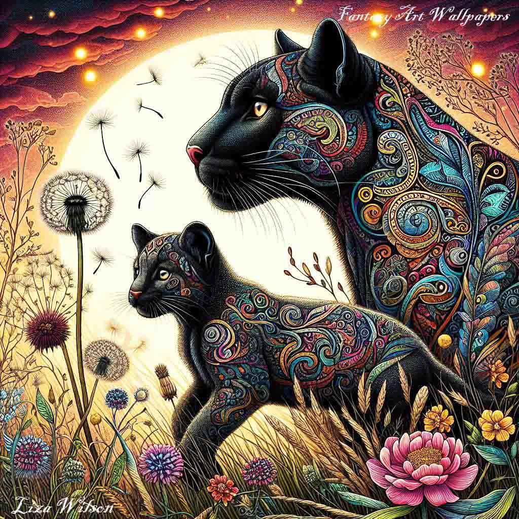Patterned black Pumas under a low setting sun & burgundy skies. There are colourful flowers & grasses.