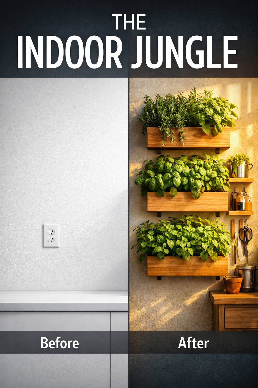 THE INDOOR JUNGLE is a modern, step-by-step guide that shows you how to turn lifeless indoor spaces into a stylish vertical herb garden—using simple tools and materials you can find at any hardware store.