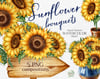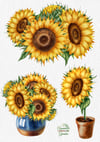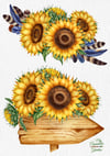 Sunflower bouquets. Compositions with wooden road-sign, clay vase and feathers