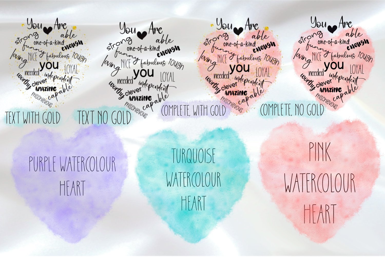 Inspirational word art, watercolour heart in 3 colours with and without gold embellishment.